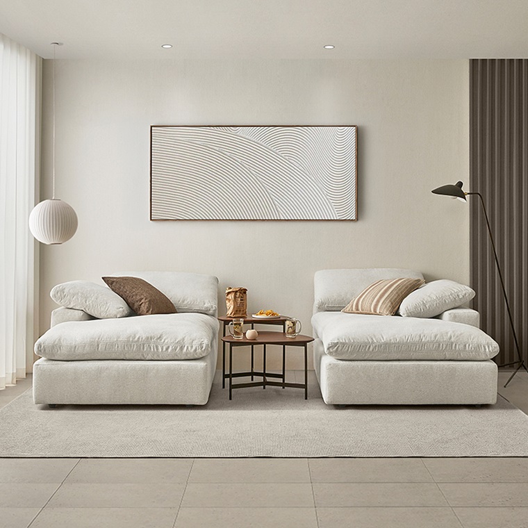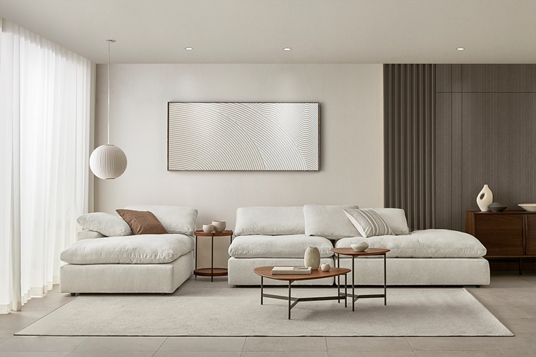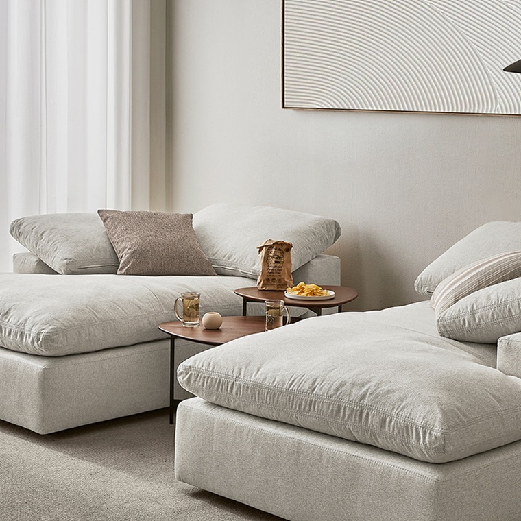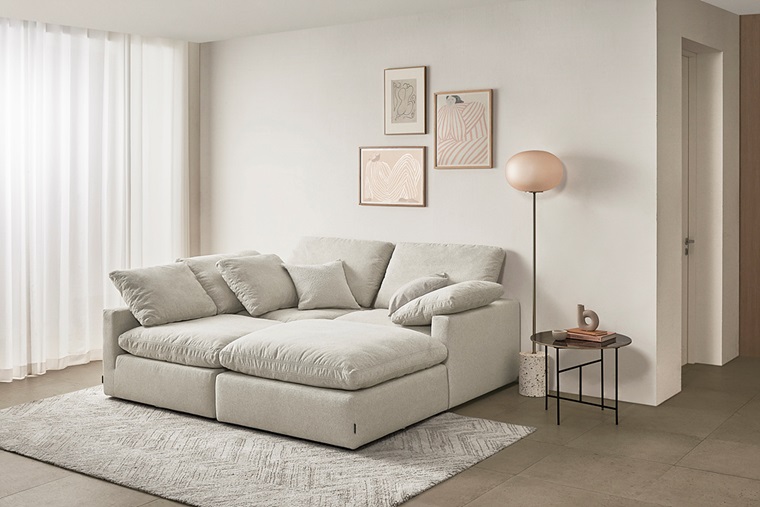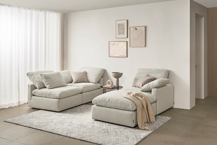 다리를 쭉 펴고 쉴 수 있는 일자형은 물론, 카우치 또는 오토만을 활용해 TV나 영화 시청에 용이하도록 배치한 시네마형, 모듈을 침대처럼 넓게 붙여 넓은 공간으로 사용할 수 있는 패밀리형, 얼굴을 마주 보고 대화하기 좋은 코너형 등 개인의 라이프스타일을 고려해 다양한 모듈 조합이 가능하다.
