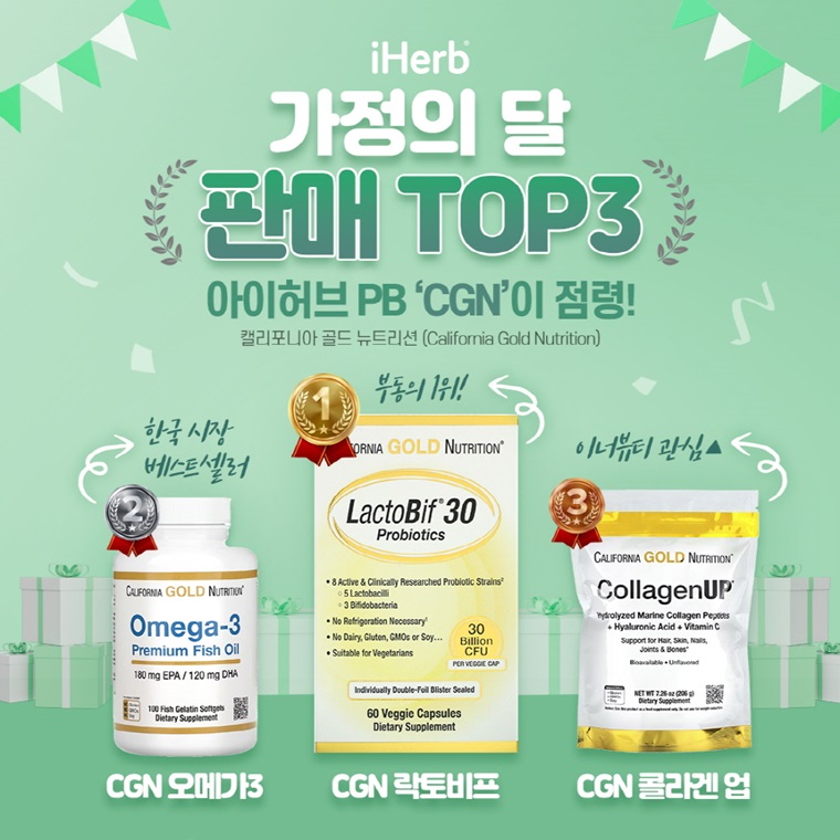 아이허브에 따르면 한국 시장 한정으로 지난 4월 22일부터 약 10일간 진행한 진행한 가정의 달 기념 할인 프로모션에서 아이허브의 대표 PB ‘캘리포니아 골드 뉴트리션(CGN, California Gold Nutrition)의 유산균 제품인 ‘CGN락토비프’가 전체 판매 1위에 올랐다.