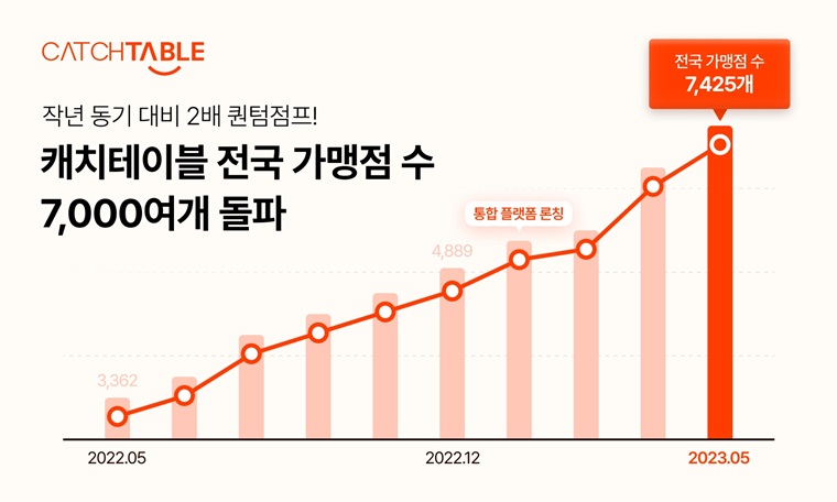 외식업 전문 통합 솔루션 기업 와드(대표 용태순)가 운영 중인 캐치테이블은 지난 5월 기준 전국 제휴 가맹점 수가 7000개를 돌파했다고 12일 밝혔다. 이는 작년 동기 대비 2배 이상 증가한 수치로 주목된다. 약 3년 여 전인 2020년 말 대비해서는 4배가량 성장한 규모다.