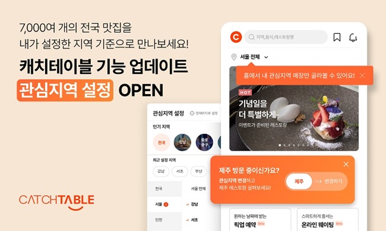 관심지역 설정 기능은 캐치테이블이 제휴를 맺고 있는 전국 가맹점들을 지역별로 세분화해 고객이 설정한 지역의 맛집 정보를 제공하거나 GPS를 기반으로 고객의 현재 위치와 가장 가까운 맛집을 추천하는 서비스다. 관심지역은 5대 광역시를 포함해 서울, 경기, 인천, 제주, 강원 등 전국을 포괄하며 캐치테이블 앱 메인 화면에서 손쉽게 이용 가능하다.