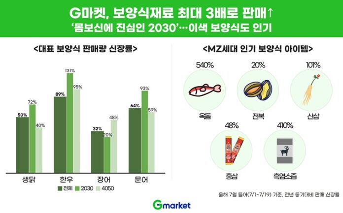 예년보다 이른 더위에 기록적인 집중 폭우까지 이어지며 온라인에서 다양한 보양식재료를 찾는 소비자가 늘고 있다. 특히, 올해는 각종 보양식을 찾는 2030세대가 급증, 4050세대보다 높은 신장률을 기록하며 전체 보양식 매출을 견인하고 있는 것으로 조사됐다.