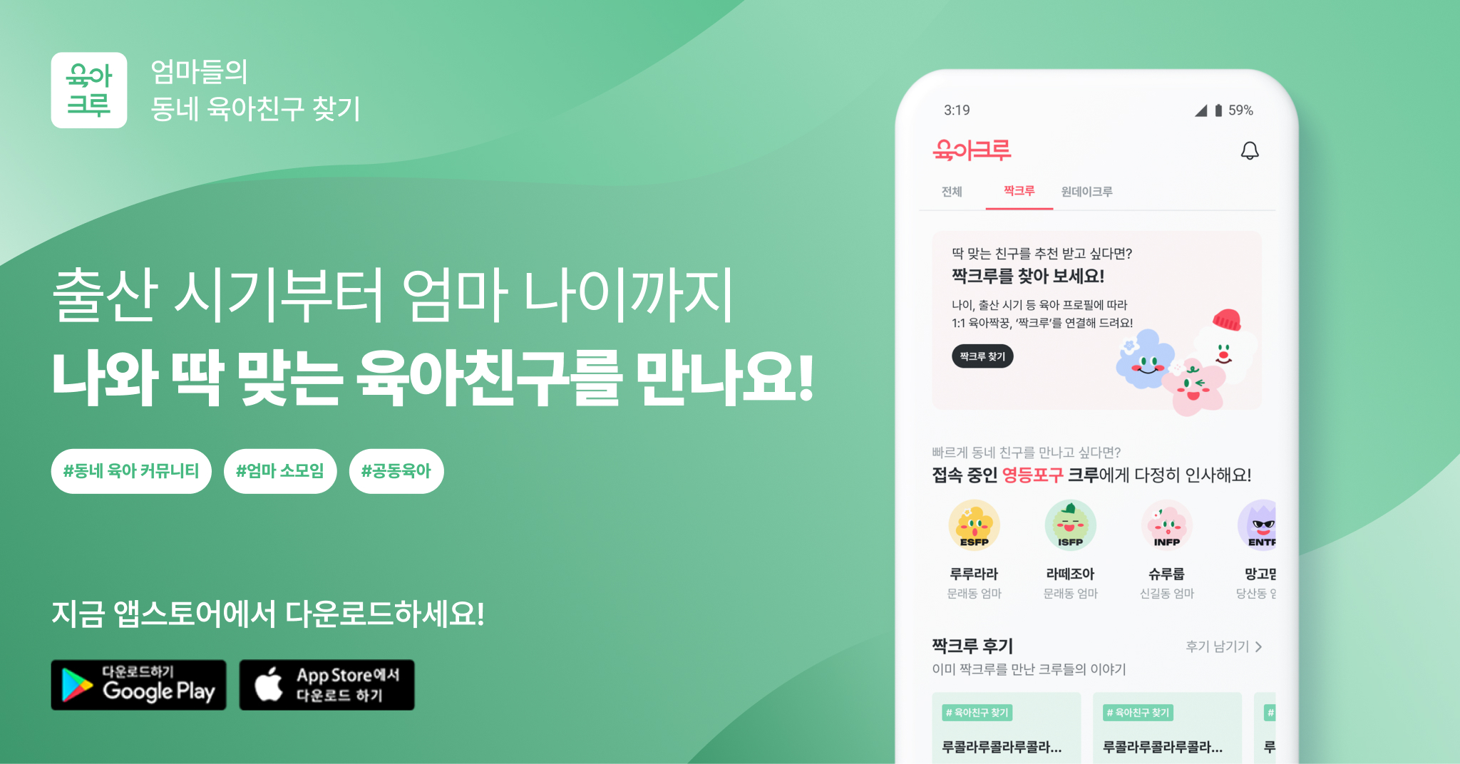 ‘육아크루’는 동네 기반 O2O 육아 커뮤니티 플랫폼으로, 가까이 사는 엄마들을 친구로 연결한다. 올해 들어 월 신규 이용자가 평균 45%씩 증가하고, 육아크루 앱에서 연결된 엄마들의 65%가 실제 오프라인 만남까지 이어지고 있다.