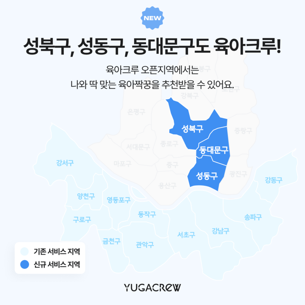 모바일앱 ‘육아크루(엄마들의 동네 육아친구 찾기 – 육아크루)’를 운영하는 주식회사 다이노즈(대표 정윤지/이가영, 이하 다이노즈)가 1:1 육아친구 연결 서비스인 ‘짝크루’를 서울시 성북구, 동대문구, 성동구로 확장했다. 이로써 해당 지역에 거주하는 엄마라면 누구나 클릭 한 번으로 사는 곳, 자녀 개월수, 엄마 나이, 직업 상태 등 육아 상황이 딱 맞는 육아짝꿍을 추천 받을 수 있다.