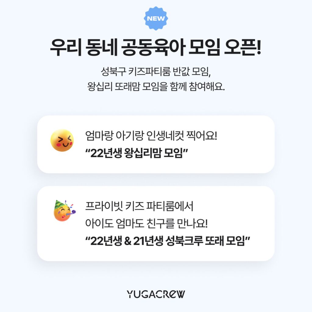 육아크루는 신규 지역 확장 이벤트로 서울시 성북구에 위치한 단독 대관 키즈파티룸 ‘도도플레이’의 반값 할인 혜택을 제공하고 있다. ‘원데이크루’를 통해 예약하면 21년생, 22년생 또래 아이들과 엄마들을 한 팀으로 구성해 준다. 서울시 성동구 엄마들은 엔터식스 왕십리역점에서 진행 되는 ‘엄마랑 아기랑 인생네컷’ 모임에 참여할 수 있다.