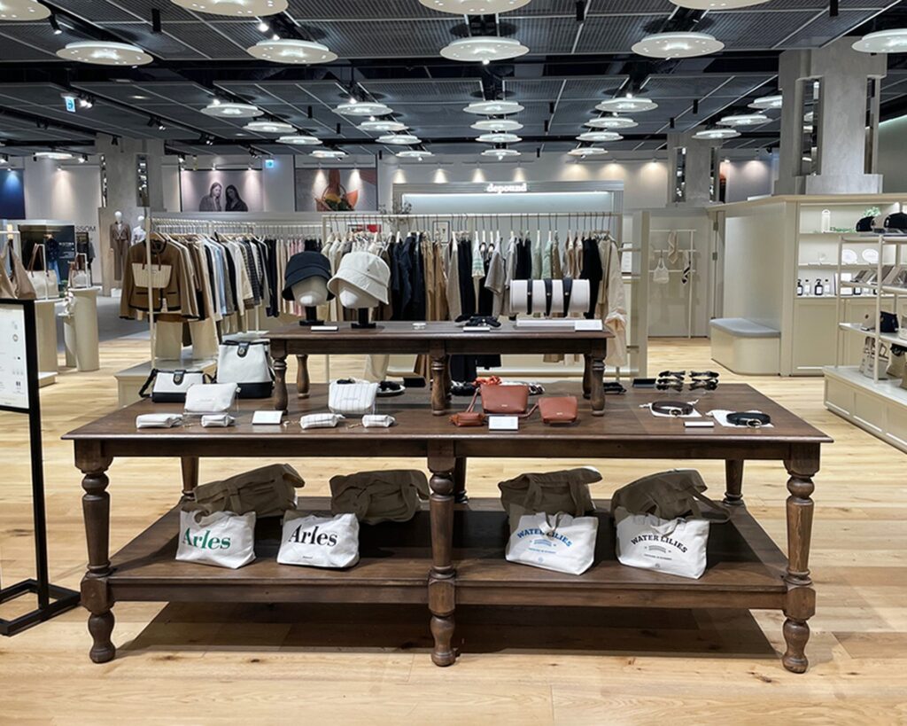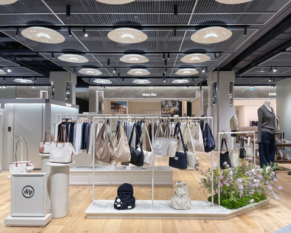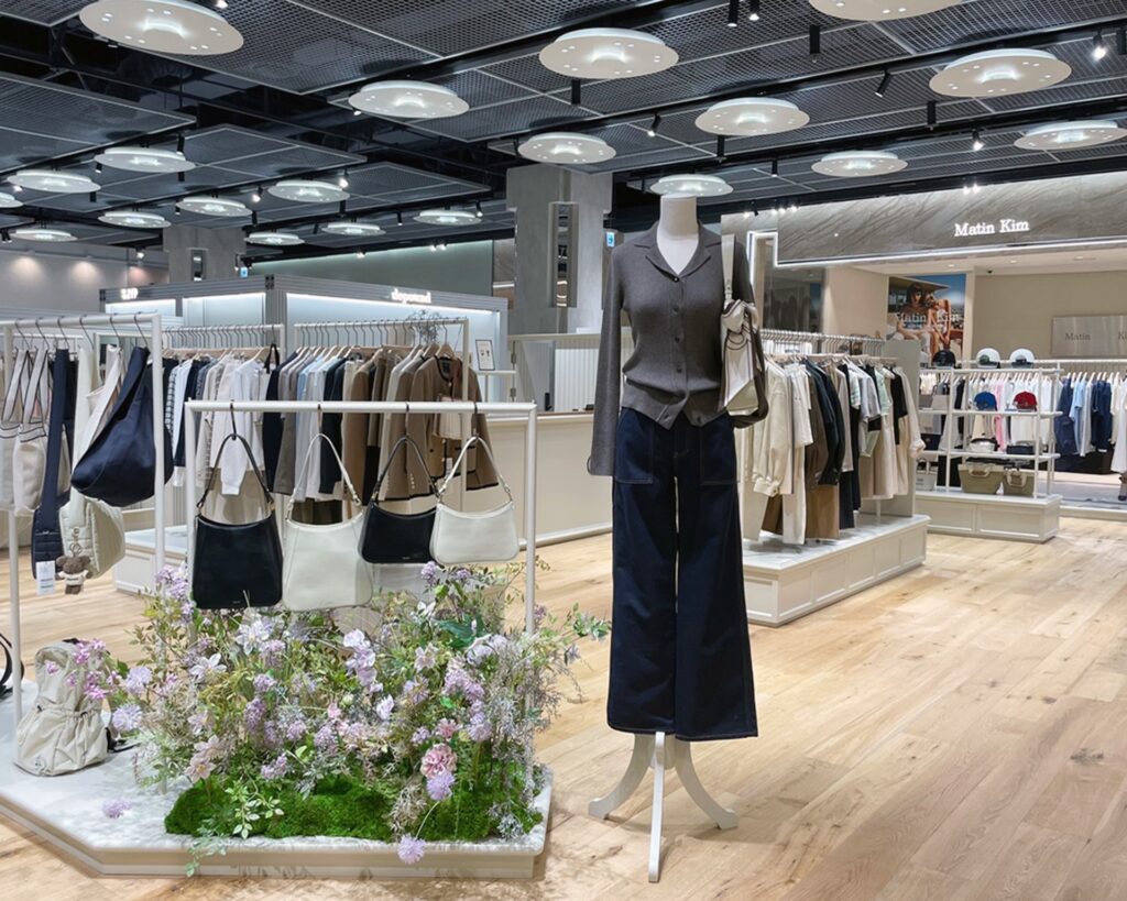 여기에 도자기나 목재 등 천연 소재의 집기로 제품들을 조화롭게 디스플레이해 감각적인 무드를 연출했다. 특히 동선을 고려한 공간 구성과 함께 기존 매장 대비 피팅룸 수를 늘리며 고객들의 편의성을 대폭 높인 점이 특징이다.