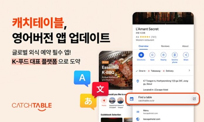 국내 1위 레스토랑 예약 플랫폼 캐치테이블이 영어버전 앱을 통해 방한 외국인 관광객을 대상으로 K-푸드의 다양한 맛을 알리는데 앞장선다. 외식업 전문 통합 솔루션 기업 와드(대표 용태순)가 운영중인 캐치테이블은 엔데믹 이후 외국인 손님 유입 증가 추세에 발맞춰 영어버전 앱 업데이트를 실시했다고 31일 밝혔다.