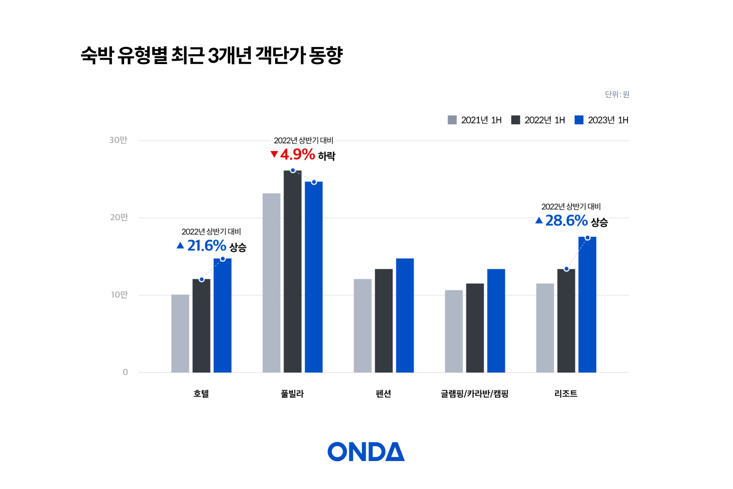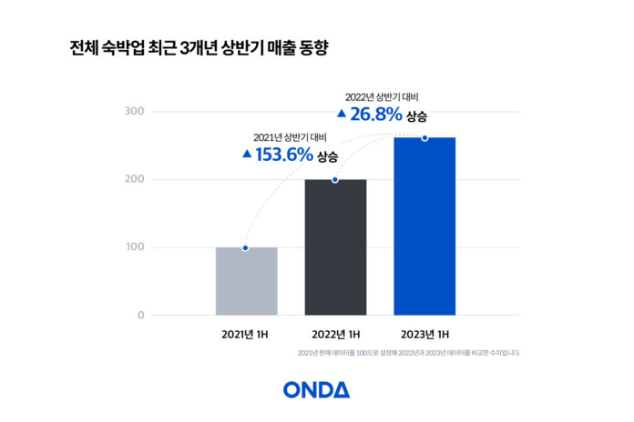 31일 호스피탈리티 테크 기업 온다(ONDA)가 발표한 ‘2023 상반기 호스피탈리티 데이터 & 트렌드 리포트’에 따르면 올해 상반기 국내 숙박업체의 온라인 매출액은 2022년 대비 27% 증가했다.