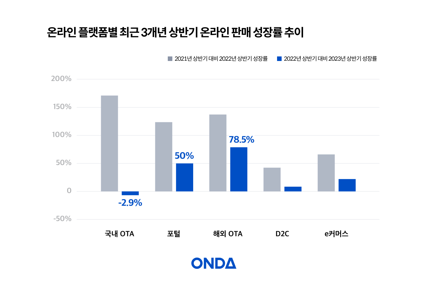 이는 2021년 대비 2022년 성장률 100%보다 73%p 떨어진 수치지만, 해외 여행 폭증으로 급격히 위축될 거라는 예상에 비해 견조한 성장세를 이어간 것으로 풀이된다. 대부분의 숙박업 지표가 상승했던 지난해와 달리 올해 상반기에는 온라인 판매채널, 업종, 지역별로 명암이 갈렸다.