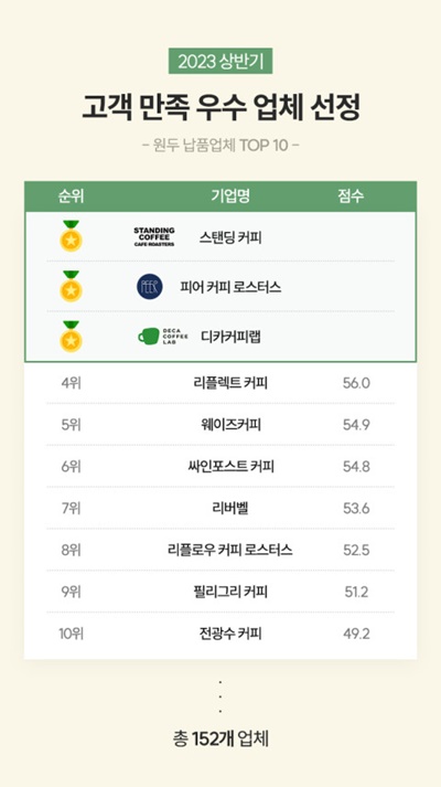 카페 점주가 가장 만족한 원두 업체로 ‘피어 커피’, ‘스탠딩 커피’, ‘디카커피랩’이 꼽혔다. 카페 B2B 납품 플랫폼 코케비즈는 올해 상반기 동안 발생한 1만5000여 건의 납품 발주를 토대로 한 조사를 통해 이들 3사를 ‘2023년 상반기 고객 만족 우수 업체’로 선정했다고 6일 밝혔다.