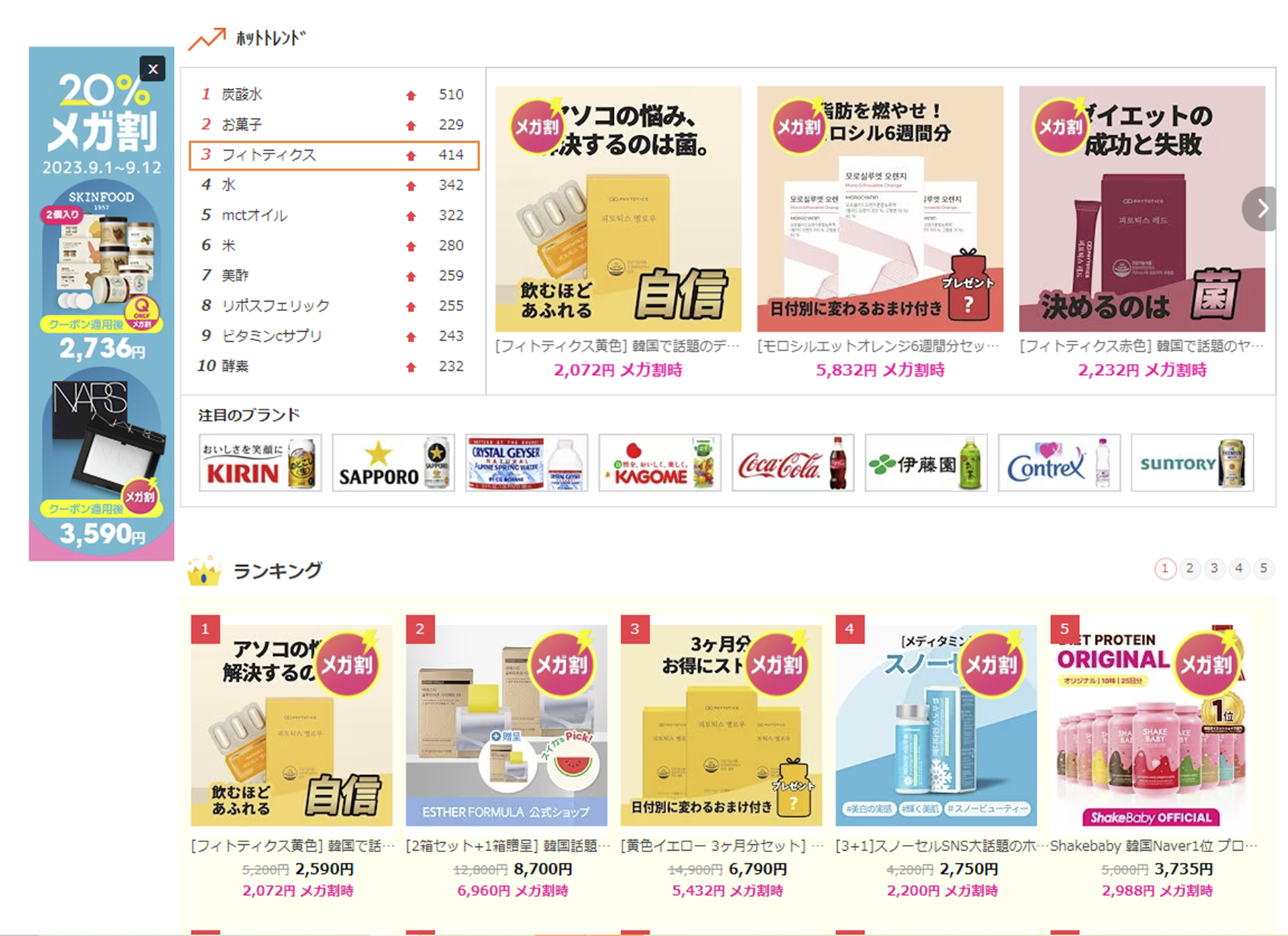 가을 메가와리는 지난 1~12일 2주간 진행했다. 6일에는 식품 카테고리 핫 트렌드 키워드 3위를 차지했으며, 식품 카테고리 실시간 1위를 기록하기도 했다. 6일 식품 핫트렌드 키워드 1위는 탄산수, 2위는 과자였으며 4위는 물이었다. 다른 순위권에는 품목이 이름을 올렸지만 피토틱스는 킥더허들의 제조한 영양제 브랜드다.