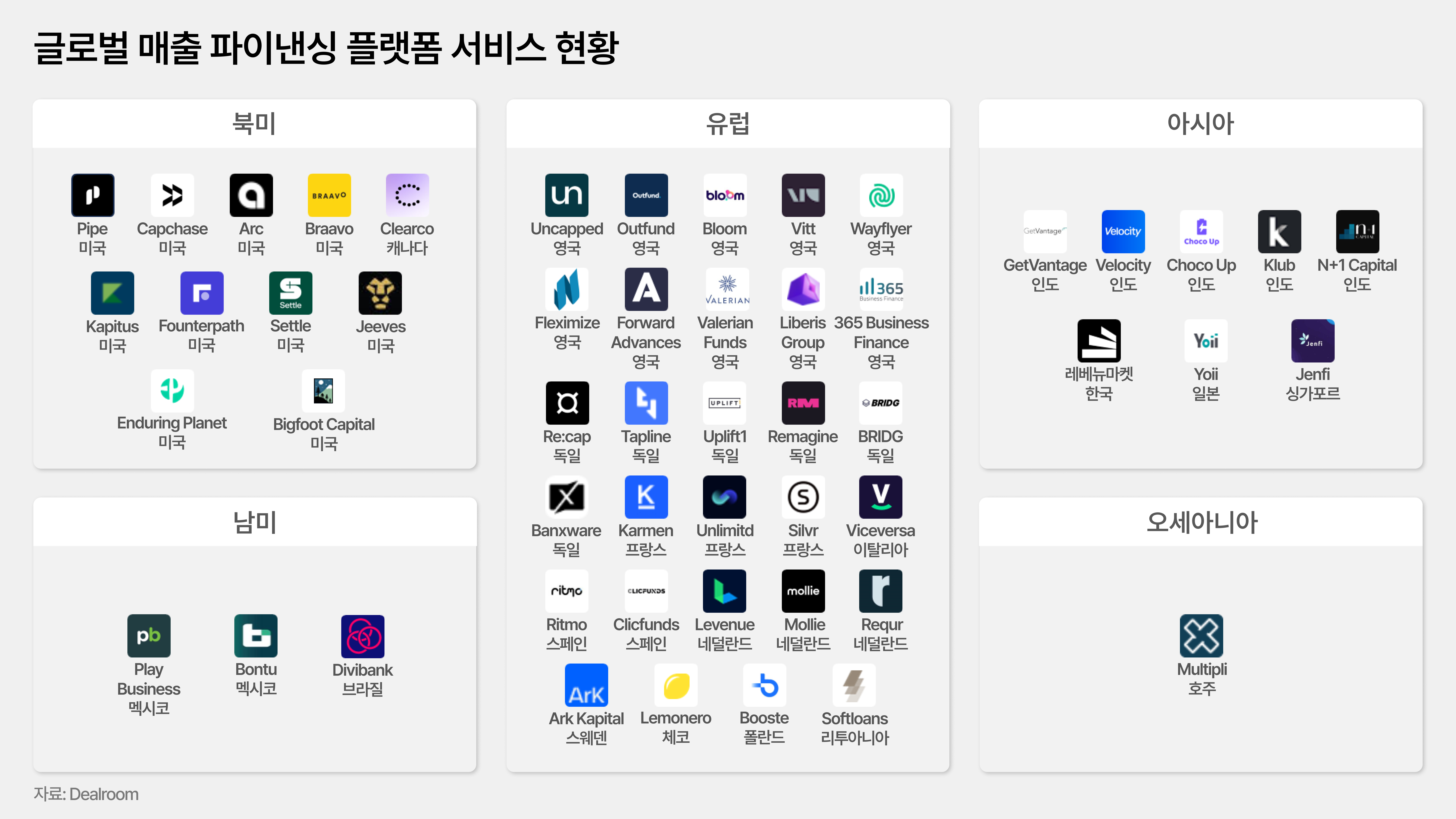 세계적인 매출 파이낸싱 열풍에 따라 북미, 유럽, 아시아 전역에서 디지털 기반의 매출 파이낸싱 플랫폼이 속출하고 있다. 매출 파이낸싱 플랫폼은 API 등 데이터 연동을 통해 기업의 은행·매출·회계 데이터를 수집, 매출과 상환 능력을 종합적으로 분석해 한도를 제공하고, 기업이 한도 내에서 미래 매출을 현금화할 수 있게 한다.