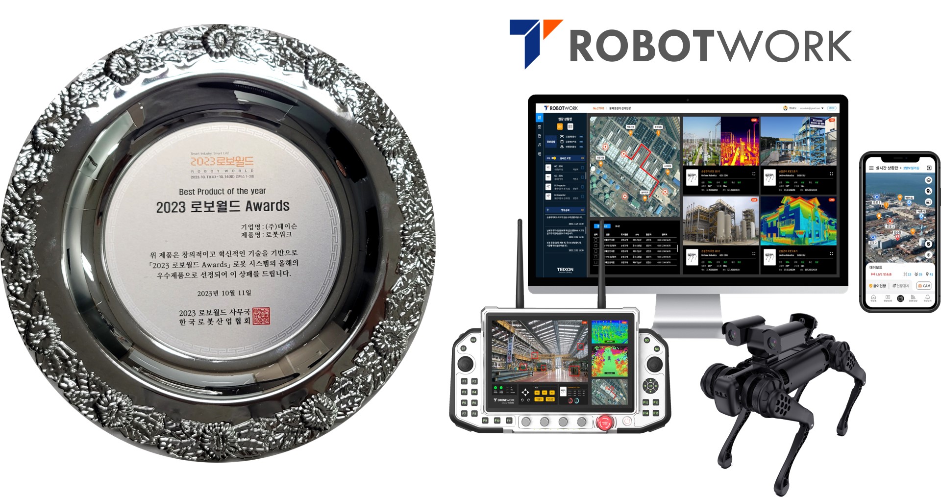 드론·로봇 운영관제 솔루션 전문기업 테이슨(대표 김영우)은 일산 킨텍스에서 열린 ‘로보월드2023’에서 자사의 제품 ‘로봇워크’가 로봇시스템 분야 올해의 우수제품상을 수상했다고 1일 밝혔다.