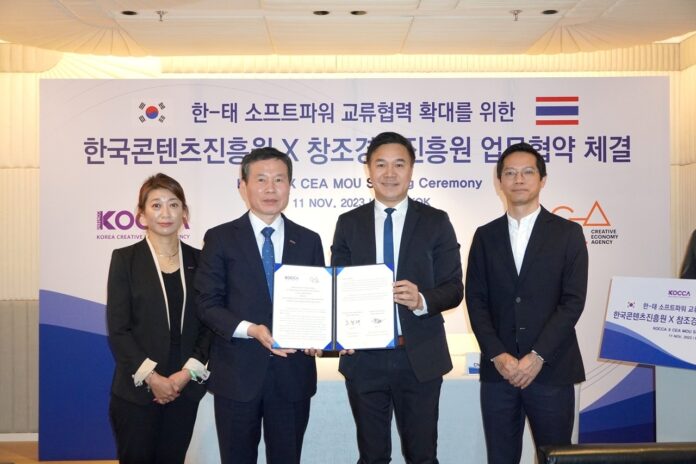 한국콘텐츠진흥원(원장 조현래, 이하 콘진원)은 태국 창조경제진흥원(Creative Economy Agency, 이하 CEA)과 지난 11일 방콕 퀸시리낏국립컨벤션센터(QSNCC)에서 업무협약을 체결했다.