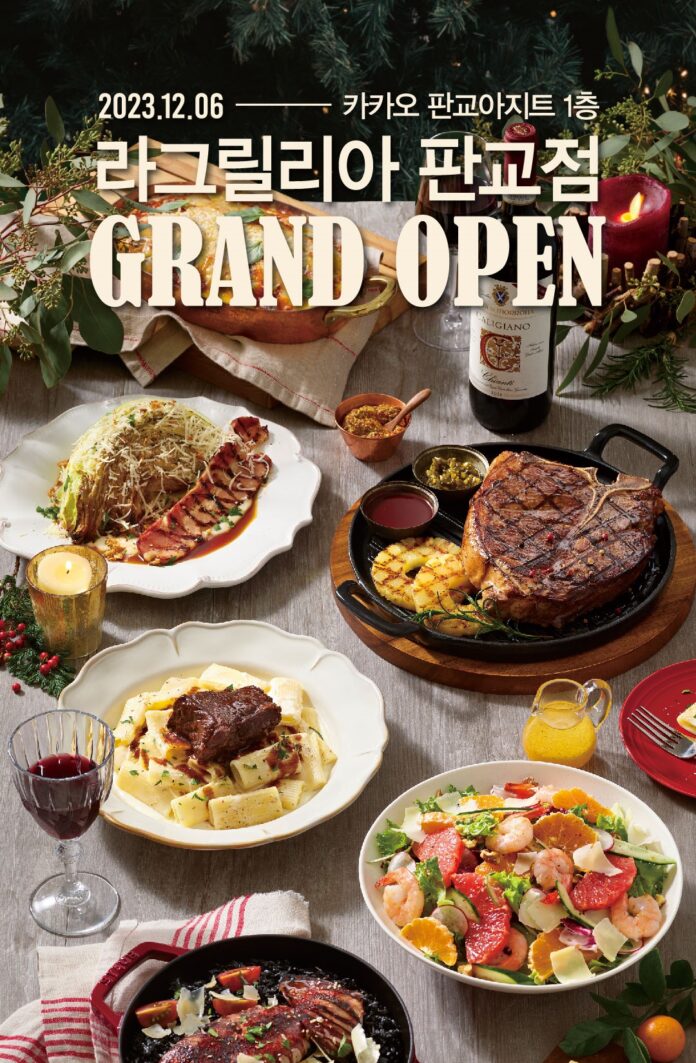 화덕에서 직접 구워낸 다양한 피자, 제철 식재료를 활용한 파스타 등 기존 대표메뉴 외에도 판교점에서만 맛볼 수 있는 압도적인 비주얼과 진한 풍미의 토마호크 스테이크를 일일 한정 수량 판매할 예정이다.한편, 라그릴리아 판교점은 오픈을 기념하여 다양한 이벤트를 진행한다. 먼저 해피포인트 애플리케이션(해피앱)에서 12월 22일까지 쿠폰 다운로드 고객을 대상으로 5만원·8만원 이상 주문 시 에그 시저 샐러드, 마르게리따 피자를 증정한다.