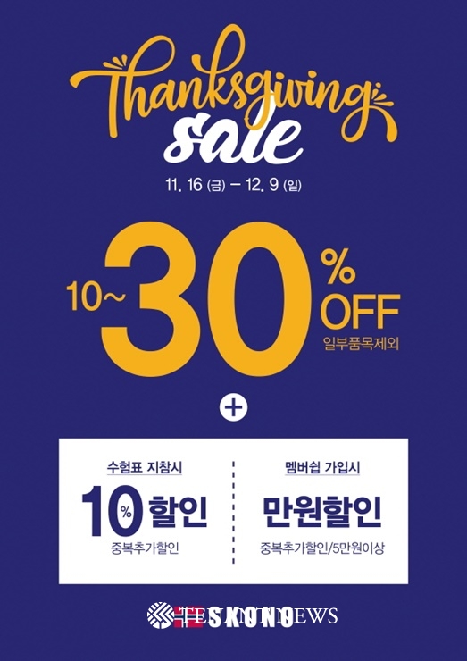 스코노의 ‘땡스 기빙 세일(Thanks Giving Sale)’은 11월 16일부터 12월 9일까지 전국 스코노 오프라인 매장에서 진행되며, 일부 품목을 제외한 스코노 18FW 주요 제품을 30%~10%까지 할인된 가격으로 만나볼 수 있다.