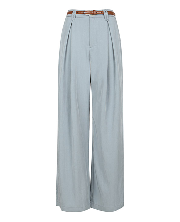 블루 컬러의 시원한 여름 소재로 제작된 와이드 슬랙스. 여유있는 핏으로 다양한 상의와 스타일링 가능하며 벨트와 SET 상품.