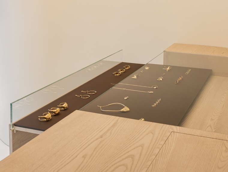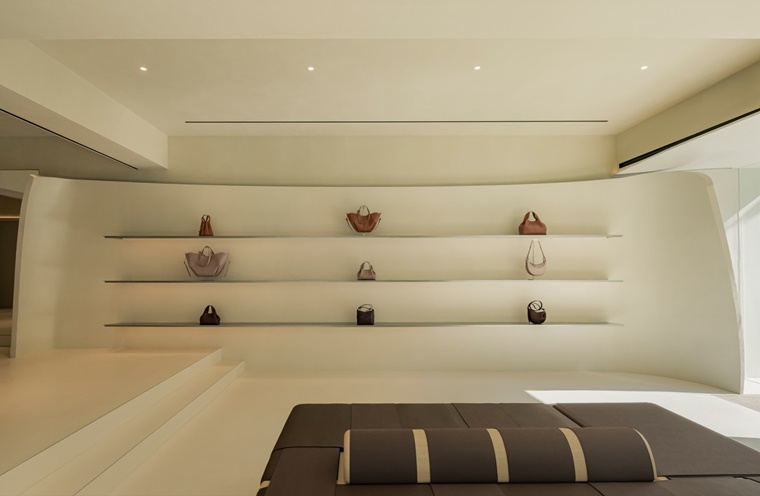 매장 내부에는 세련되고 간결한 공간을 바탕으로 다양한 소재와 색상이 어우러진 섬세한 조화가 눈길을 사로잡으며, 그 뒤로 이어지는 가죽 의자와 임정주 가구 디자이너가 은행나무를 조각하여 만든 가구, 그리고 가죽의 질감을 사실적으로 묘사한 이다솔 작가의 도자기 탁자를 볼 수 있다.
