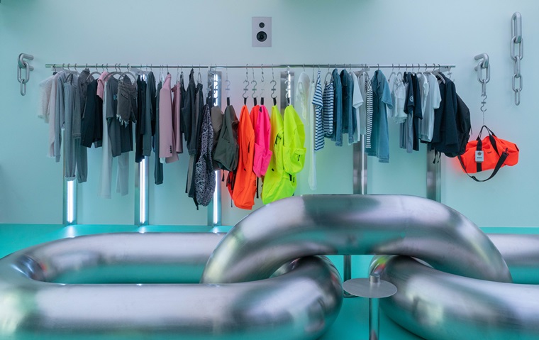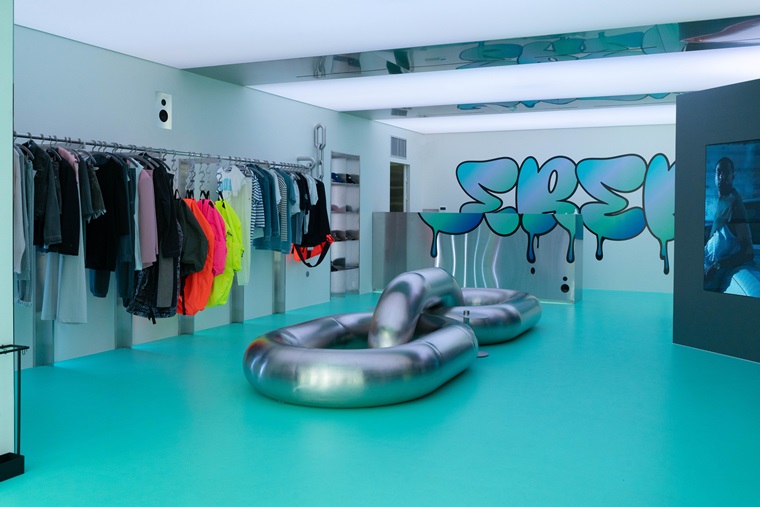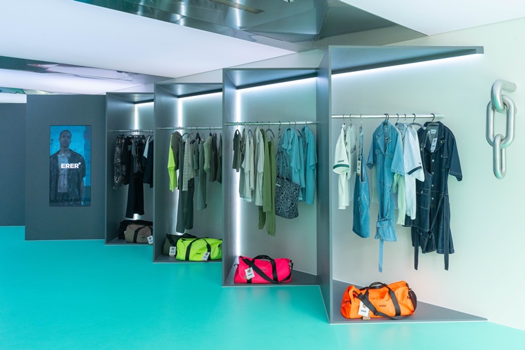 에르에르 한남 플래그십 스토어는 디자인 오브제와 색상이 시시각각 변하는 천장 조명 인테리어를 포인트로, 메탈 체인 오브제들과 그래피티로 에르에르만의 무드를 표현했다. 탈의실에는 유니크한 구조의 거울을 설치해 고객들이 다양한 각도에서 보다 세밀히 제품을 착용한 모습을 확인할 수 있도록 했다.