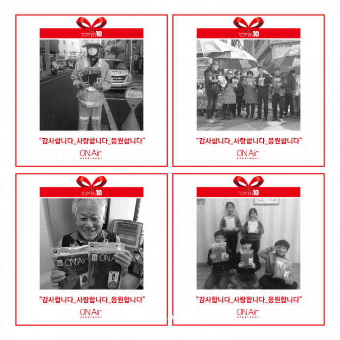 탑텐은 이번 캠페인을 통해 본사가 위치한 강동구 환경미화원들과 기초수급 독거노인 분들에게 전달하였고, 부산 플래그십 스토어 광복점 앞 비프광장 상인들을 비롯해 강원도 소재의 작은 학교 상동 중, 고등학교 전교생들, 그리고 의정부 소재 ‘이삭의 집’ 어린이들에게도 탑텐 온에어 제품을 선물하였다.
