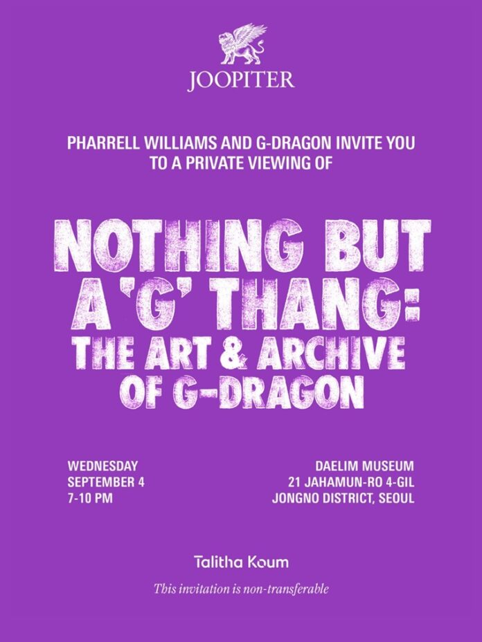 한편, 주피터가 진행하는 지드래곤 소장품 경매 행사에서는 지드래곤의 패션, 현대미술, 디자인 오브제와 직접 커스터마이징한 예술 작품이 출품됐다. 공개된 옥션 품목에는 지드래곤이 커스텀한 피스 마이너스원 재킷과 Off-White x Nike Air Jordan 1 한 켤레, 샤넬 벨트 등이 포함돼 있다. 4일 열리는 파티 행사에는 퍼렐 윌리엄스가 직접 참석해 옥션 전체 작품을 선보인다.
