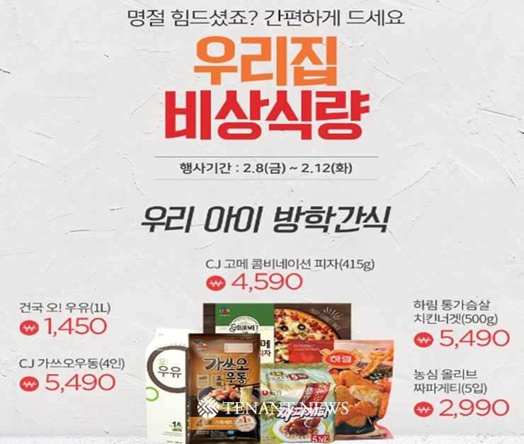 8일부터 오는 12일까지 진행하는 ‘우리집 비상 식량’ 행사에서 만나 볼 수 있는 대표 상품으로는, ‘우리아이 방학 간식’ 코너에서 ‘CJ 고메 콤비네이션 피자(415g)’를 4590원에, ‘건국 오! 우유(1L)’를 1450원, ‘하림 통가슴살 치킨너겟(500g)’을 5490원에 판매하며, ‘CJ 가쓰오 우동(4인)’을 5490원에 판매한다.