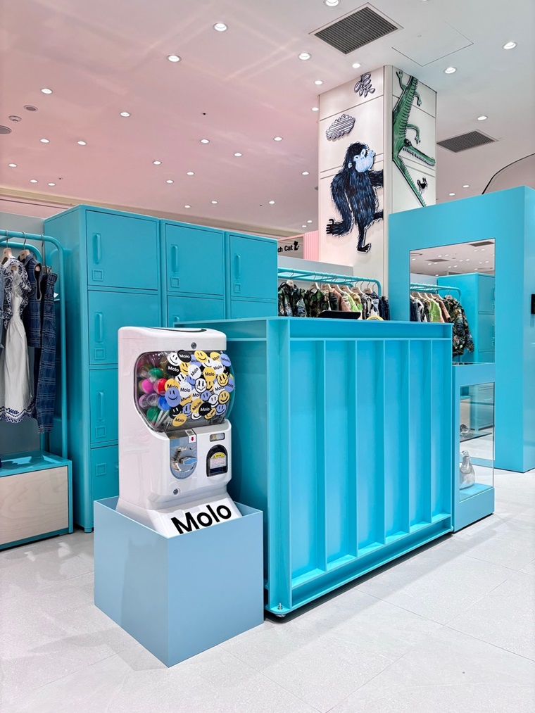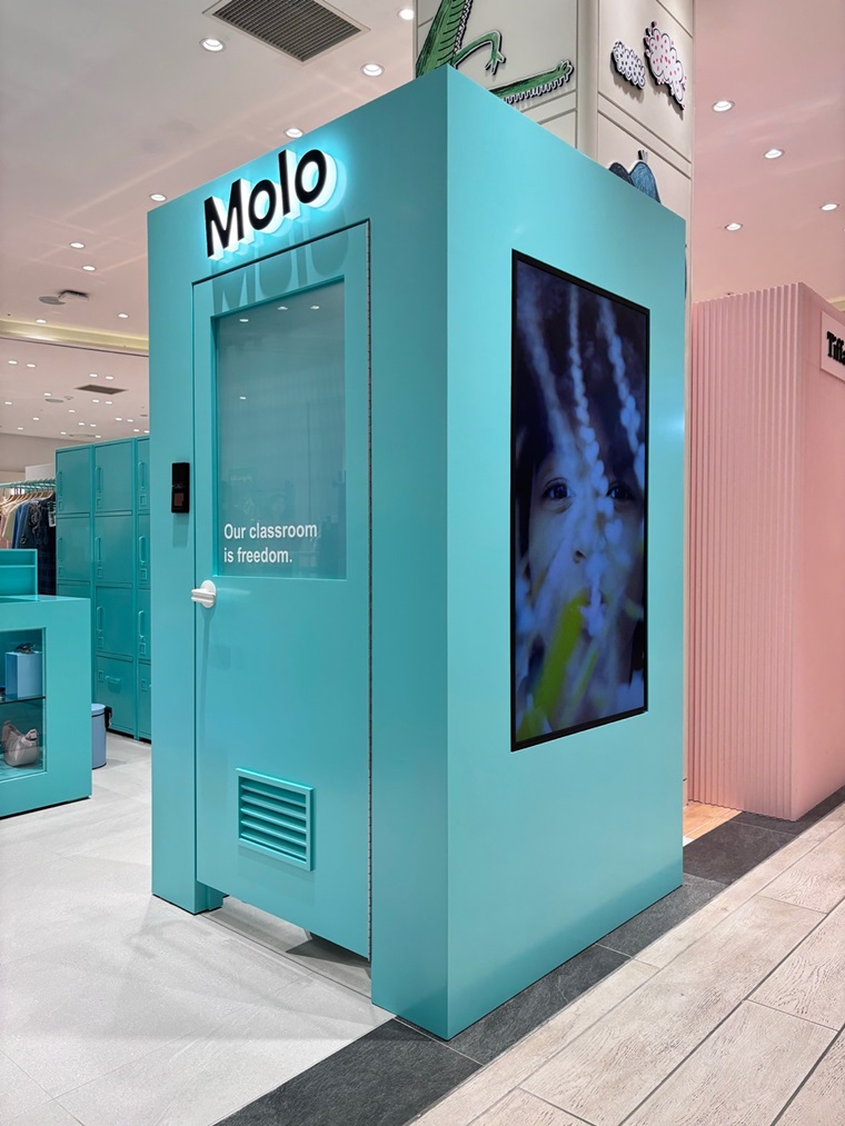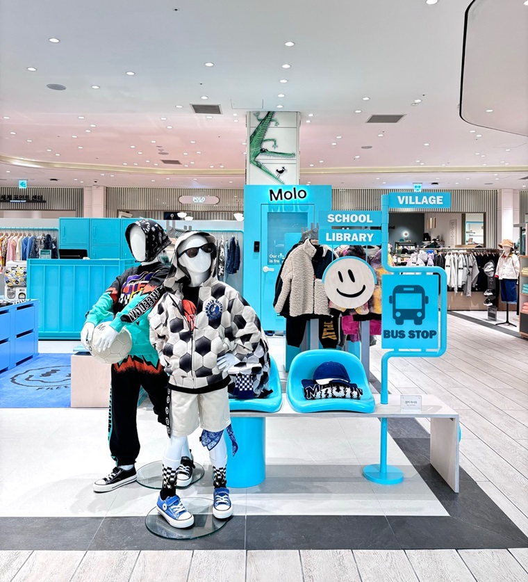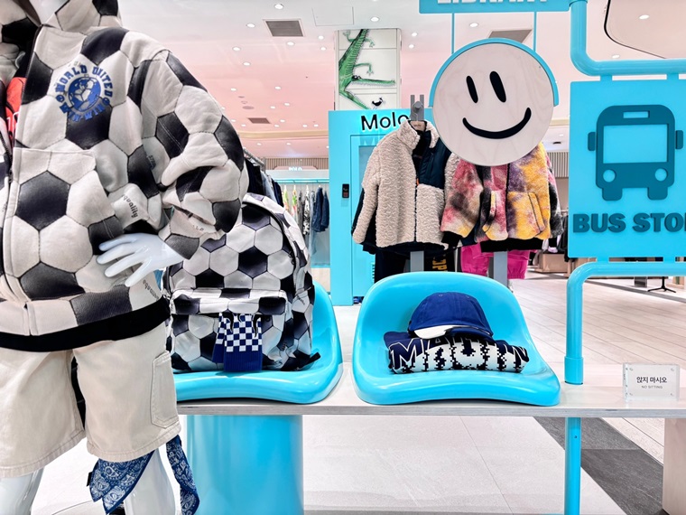 ‘몰로 신세계 강남점’의 인테리어는 버스 정류장 콘셉트로, 스카이 블루 컬러가 포인트로 사용돼 톡톡 튀면서 귀여운 매장 분위기를 조성하고 있다. ‘몰로’는 이 매장을 통해 개성을 중시하고 친환경 가치 소비를 추구하는 3040세대 젊은 부모 고객들의 취향을 공략할 계획이다.