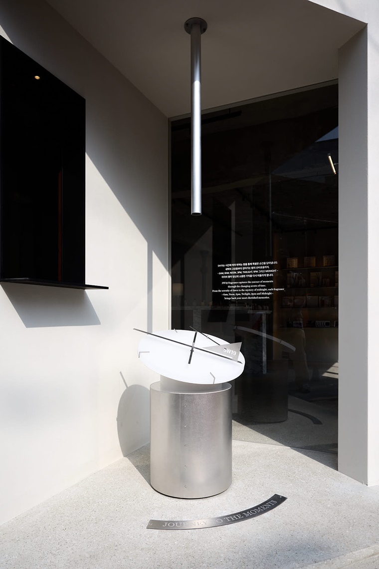 SW19 성수 스토어 내부 중심을 잡아주는 센터피스는 시계에서 영감을 받아 마치 시계의 조각들이 맞춰지는 이미지를 건축적으로 표현했다. 매장 외관에 설치된 타임피스는 움직임에 따라 그림자가 변하며, 매 순간 새로운 이미지를 만들어낸다.