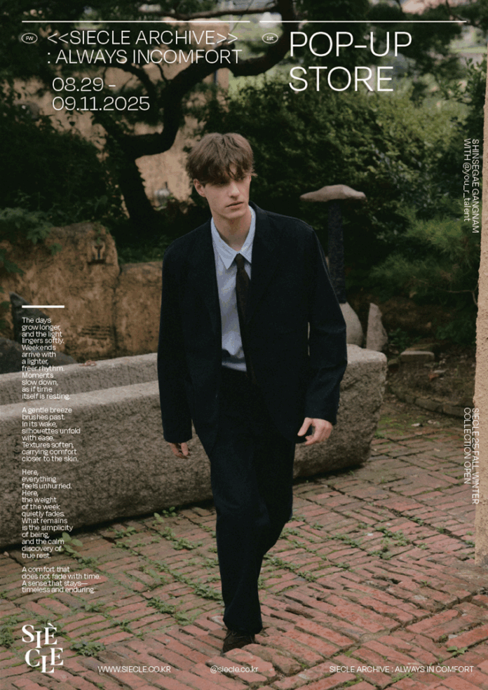 시에클 관계자는 “이번 ‘SIECLE ARCHIVE : Always in Comfort’ 팝업은 시에클이 추구하는 ‘시간이 지나도 변치 않는 편안함’을 직접 경험할 수 있는 자리”라며, “편안함과 스타일을 모두 갖춘 시에클의 감각을 많은 고객들이 가까이에서 느껴보길 바란다”고 말했다.시에클은 슬로건 ‘Timeless Comfort’를 바탕으로, 시간이 지날수록 가치가 더해지는 안온한 옷을 제안하는 브랜드로, 소재와 실루엣, 담백한 디테일까지 세심하게 다듬어 유행에 흔들리지 않는 편안함과 스타일을 동시에 추구한다.
