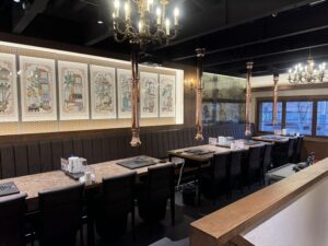 뼈탄집 용산 직영점 2층 내부에 올라서면, 앤티크 한 분위기와 통창으로 개방감 있는 분위기를 느낄 수 있다.