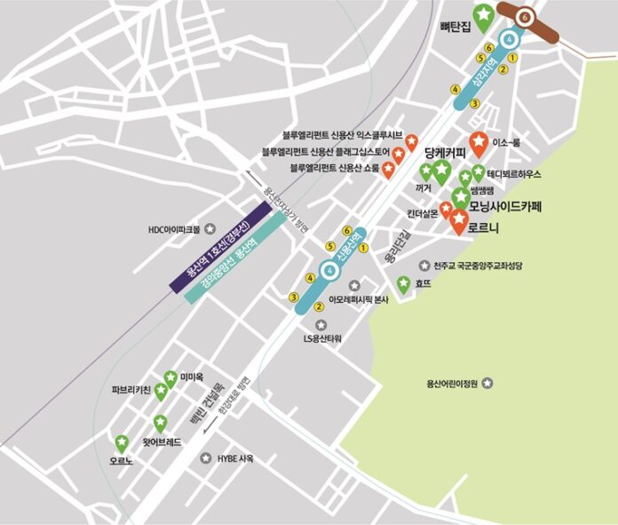 용리단길은 삼각지역부터 한강대교 방향 아모레퍼시픽 사옥 인근까지를 가리킨다.