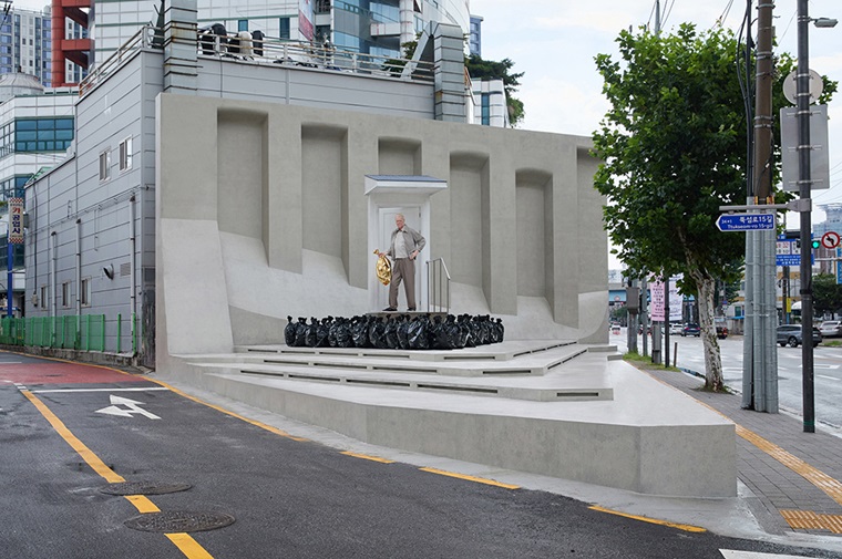 수많은 검은 비닐봉지가 파도처럼 일렁이며 공간 전체가 살아 움직이는 듯한 장면을 연출했고, 중앙에 자리한 실물보다 크게 구현된 노인의 조형물은 생동감 있는 눈빛으로 공간 너머의 이야기를 응시했다. 노인의 손에 쥐어진 황금빛 봉지는 호기심과 발견의 상징으로, 보는 이들로 하여금 그 안에 담긴 기억·비밀·꿈을 상상하게 했다. 끝없이 이어지는 검은 파도 속 황금빛 봉지는 예상치 못한 곳에서 발견하는 의미와 아름다움을 상징하며 강렬한 메시지를 남겼다.