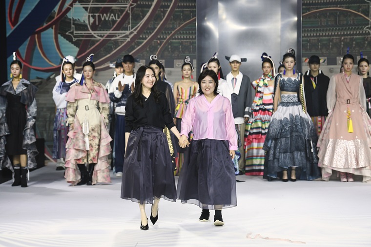 왼쪽부터 윤상아 대표와 조앤(송지은)이사가 손을 잡고 런웨이 무대를 걷고있다.