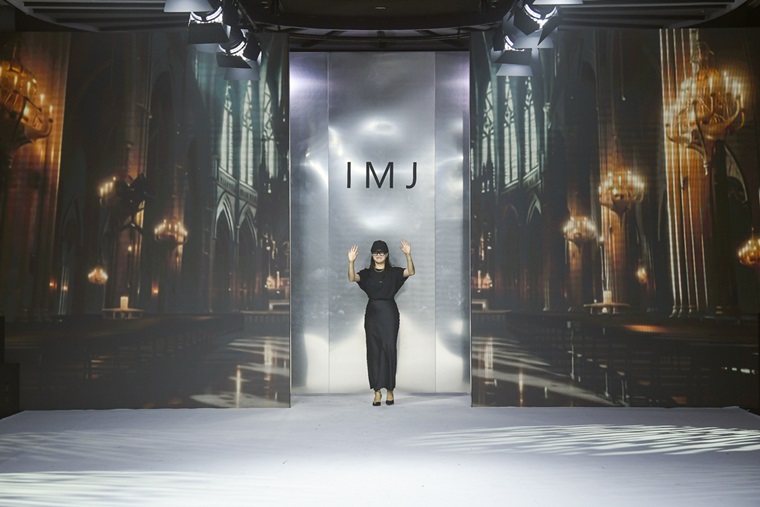 IMJ의 임지윤 디자이너가 무대 위에서 손을 흔들고 있다.