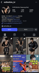 에스더 킴의 SNS에서는 7.5만 팔로워를 보유한 ‘건강전도사 아놀드 홍’과의 케미가 돋보인다. 2018년, 현 ‘넥시컷 챌린지’의 전 버전인 ‘백일간의 약속’에 참여하면서 당시 프로그램을 이끈 ‘아놀드 홍’과 연을 맺어왔다. 에스더 킴은 프로그램 참여 100일 동안 매일 그와의 활동을 SNS에 기록하면서 변화하는 모습을 통해 주목받았다.