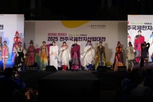 1부 전주한지국제패션쇼에서는 주제인 ‘결(結)’에 맞춰 해외 세계종이작가총회(IAPMA) 회원들과의 협업으로 한지의 글로벌 위상을 선보였습니다. 특히 ‘케이팝 데몬 헌터스(K-Pop Demon Hunters)’를 연상시키는 남성 모델들의 등장은 고전적인 패션 트렌드와 창의적인 한지 작품들이 결합된 혁신적인 무대로, 관객들에게 강렬한 인상을 남겼다.