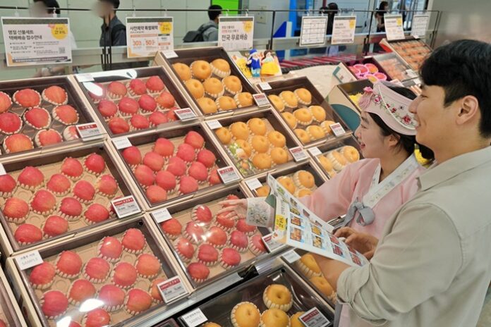 ‘충주사과(3kg 내외)’와 ‘나주배(3kg 내외)’는 각각 2만 9900원, 2만 4900원에 내놓는다. ‘상주 곶감(情)’과 ‘제스프리 골드키위(2.5kg 이상)’는 가족 먹거리용 선물세트로, 엘포인트 회원에게 1만원 할인 혜택을 제공해 각각 3만 9900원, 4만 9900원에 판매한다.