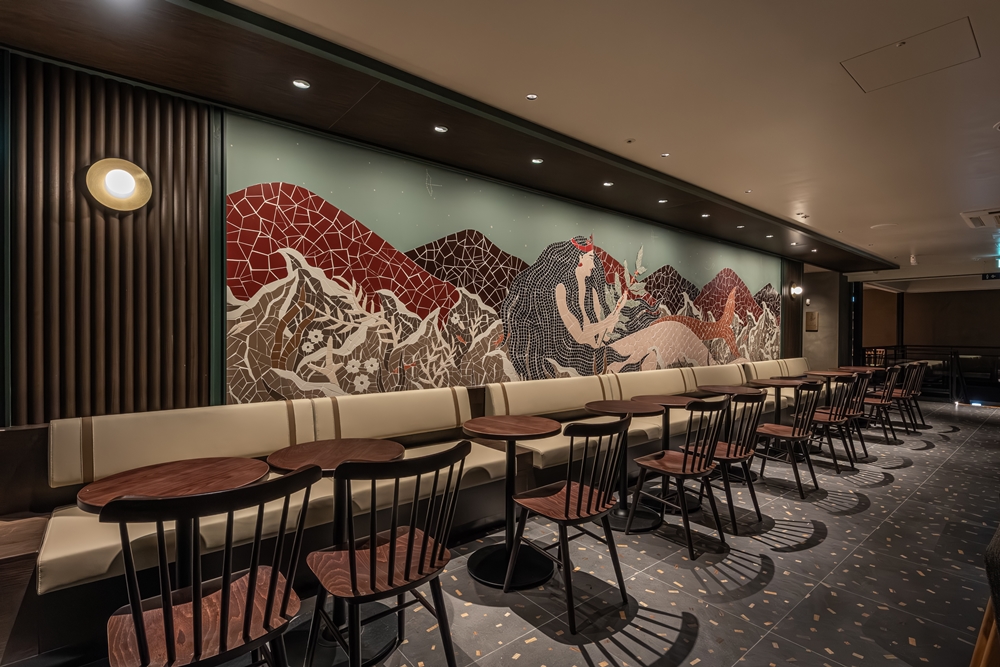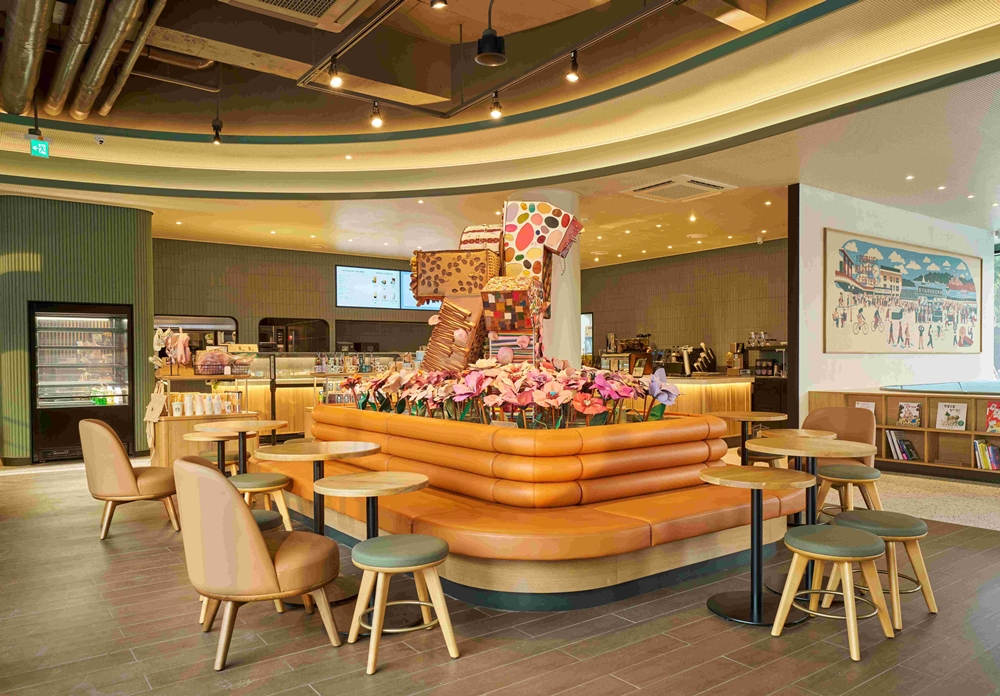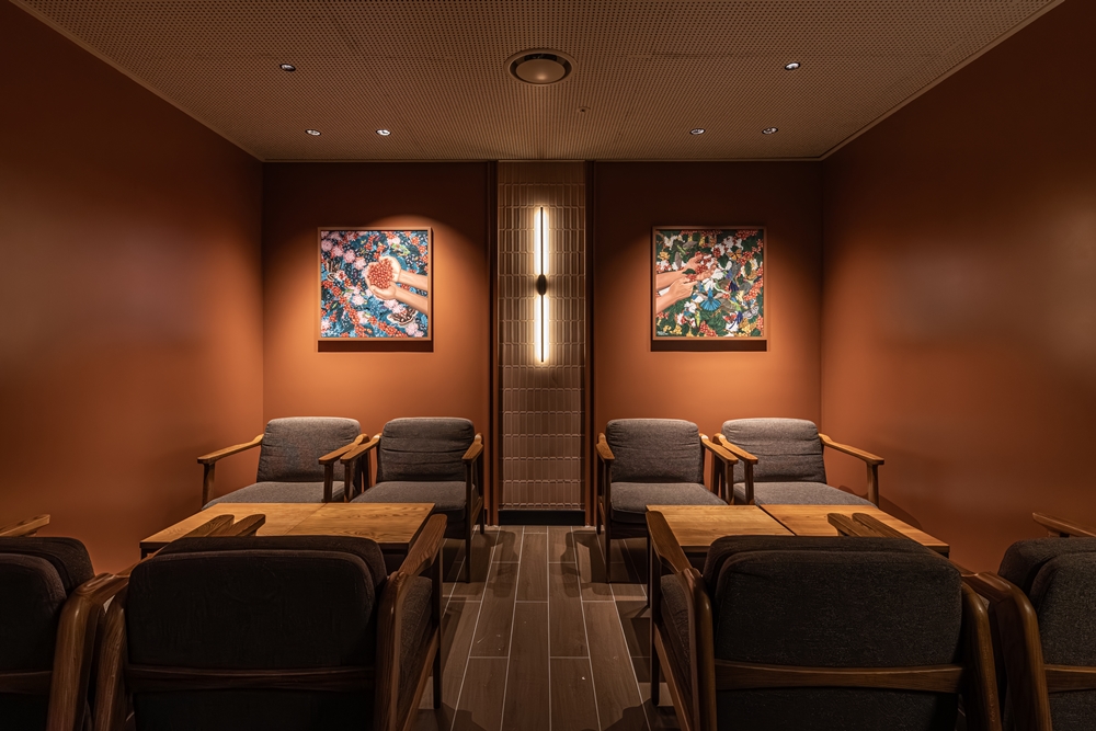 매장을 들어서면 토양을 나타내는 흙빛 타일 인테리어가 적용된 1층 공간이 고객을 차분하게 맞이하고, 아이보리와 화이트 톤 두 개의 구역으로 나뉜 2층의 각 공간은 씨뿌리기와 꽃피우는 순간을 표현했다. 한 층을 올라가면 꽃이 무르익어가는 여정을 그린 아트웍과 커피 수확의 순간을 연상시키는 모자이크 타일 아트웍이 수확의 기쁨을 나타내며 커피 여정을 마무리 짓는다.
