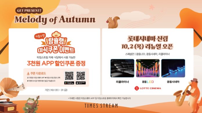 타임스트림은 이러한 인기에 힘입어 이달 말까지 ‘탐슐랭 미식 쿠폰 이벤트’를 이어간다. 이벤트는 오는 31일까지 진행되며, 타임스퀘어 APP 회원 대상 타임스트림 내 식당·카페에서 1만 2천 원 이상 구매 시 사용할 수 있는 3천원 할인 쿠폰이 제공된다. 해당 쿠폰은 ‘담솥’, ‘스시노칸도’, ‘해방촌부대찌개’, ‘탕화쿵푸’, ‘트윗젤’ 등 매장에서 사용할 수 있다.