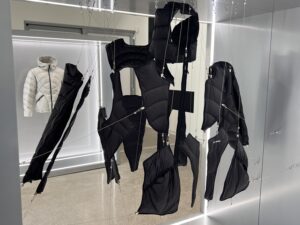 2층으로 올라가면 헬리녹스 웨어 제품 판매 공간과 2025 FW 컬렉션 전시 공간이 구성돼 있다. 특히 전시장 내부로 들어서면 ‘헬리녹스 웨어’가 추구하는 대비와 조화의 가치를 담아내는 ‘듀얼리티(Duality)’에 집중한 공간임을 알 수 있다. 빛을 차단하고 어둡게 설계해 브랜드명에 담긴 태양신 ‘헬리오스’와 밤의 여신 ‘녹스’를 팝업 스토어 현장에 대비되게 설계했다.