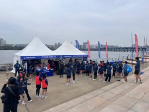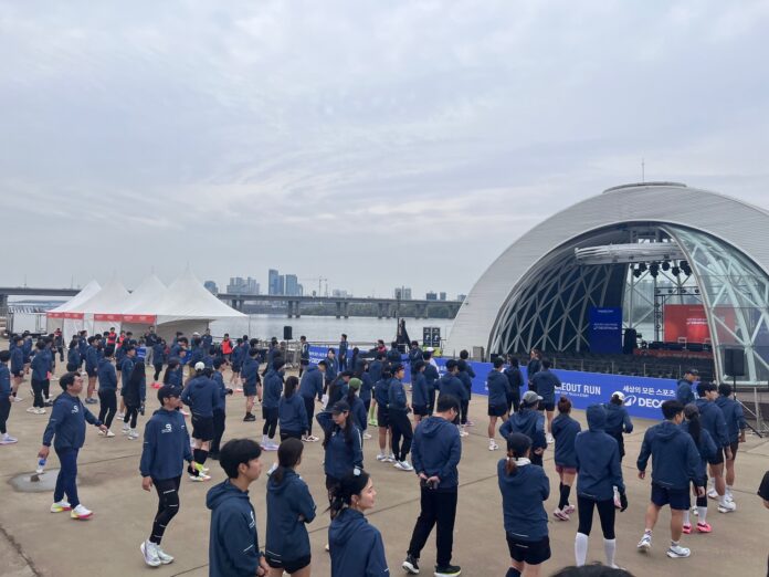 이날 달리기 행가가 있었는데 본격적인 러닝 행사에 앞서 전문 코치들의 지휘 아래 워밍업 세션이 진행됐고, 각 페이스별로 구분한 5개 그룹이 차례대로 출발했다. 여의도 공원 한 바퀴, 약 5.5km를 뛰는 동안 데카트론 제품을 착용한 200여 명의 러너들의 행렬이 한강변 풍경과 어우러져 진풍경을 이뤘다.
