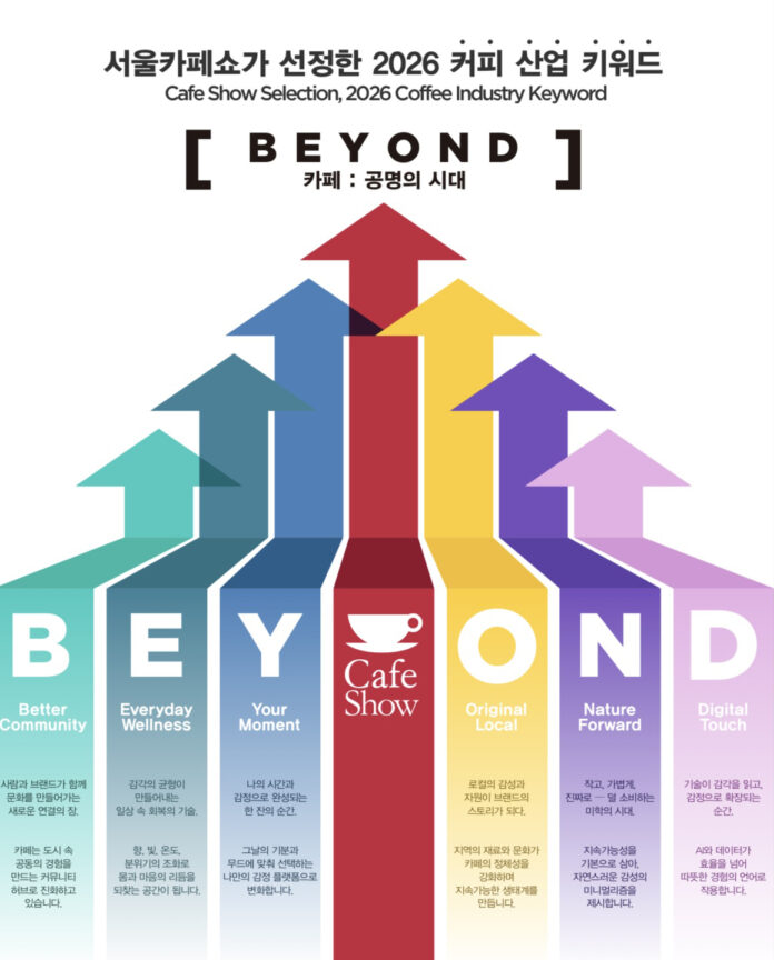 서울카페쇼가 발표한 이번 키워드인 ‘비욘드(B.E.Y.O.N.D, 카페:공명의 시대)’는 ‘Better Community(새로운 연결의 장)’, ‘Everyday Wellness(일상 속 건강)’, ‘Your Moment(나만의 시간)’, ‘Original Local(로코노미), ‘Nature Forward(지속가능성)’, ‘Digital Touch(기술 혁신)’의 변화를 예측한 단어로 이를 통해 2026년 커피 산업의 트렌드를 담았다.