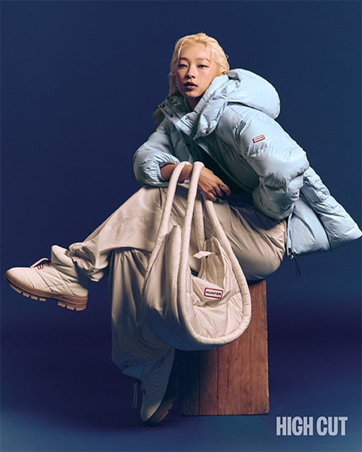 화보 속 KYOKA는 헌터의 다운자켓과 패딩부츠를 활용해 세 가지 겨울 스타일링을 선보였다. 먼저 웜그레이 컬러의 ‘글로시 다운재킷’과 ‘원더러 레이스업 아웃도어 부츠’로 스트리트 감성과 캐주얼 무드를 조화롭게 완성했다.