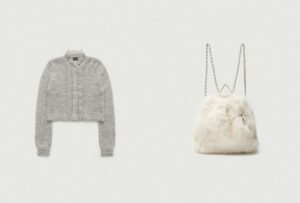 (왼쪽부터) 헤일 프릴 모헤어 가디건, 퍼 드로스트링 백팩