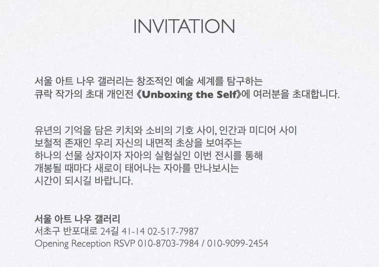 전시는 서울 서초구 반포대로 24길 41-14에 위치한 서울 아트 나우 갤러리에서 진행되며, 오프닝 리셉션은 11월 26일 오후 5시부터 8시까지 열린다. 초대의 글에서 “전시를 통해 개봉될 때마다 새로이 태어나는 자아를 만나보길 바란다”는 메시지를 전하며 관람객들의 참여를 독려했다. 유통·문화 콘텐츠의 접점이 중요한 시대, 이번 전시는 예술이 소비자 경험을 확장시키는 방식에 대해 다시 한번 생각하게 하는 자리로 기대된다.