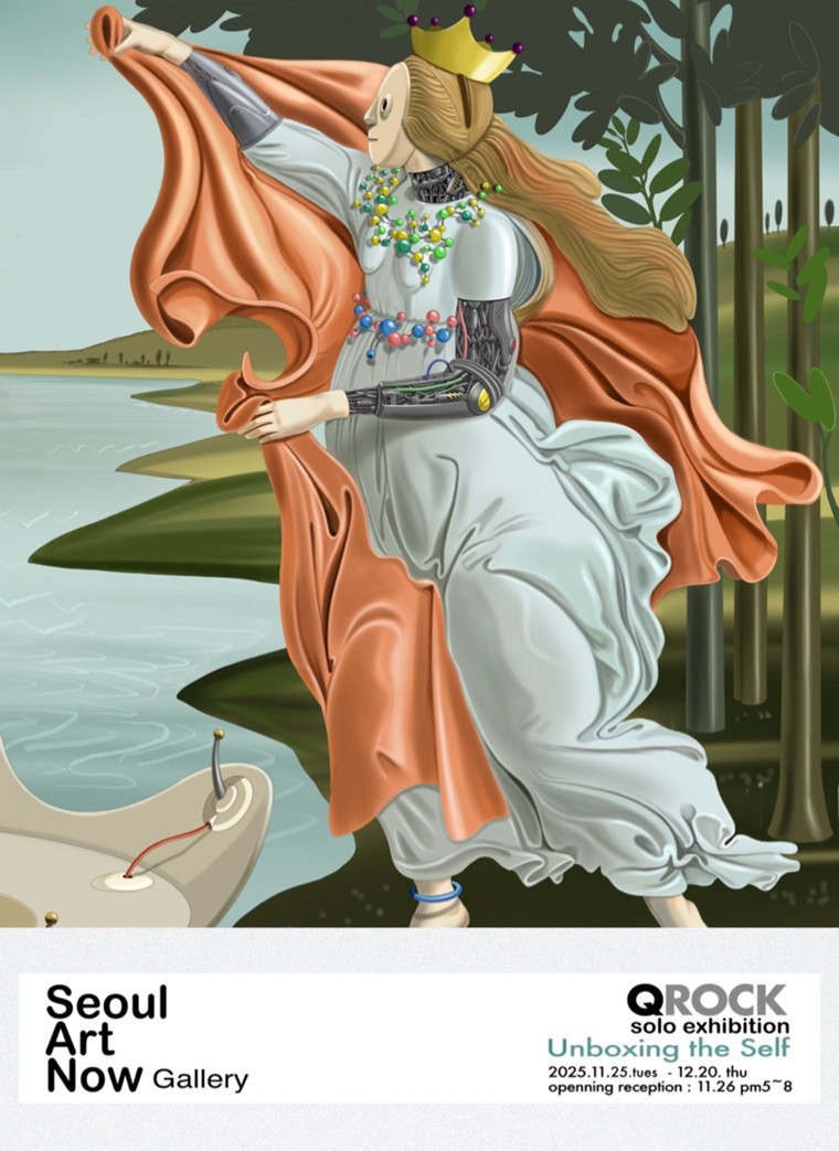 서울 아트 나우 갤러리가 창조적 예술 세계를 탐구하는 작가 큐락(QRock)의 개인전 ‘Unboxing the Self’가 오는 11월 25일부터 12월 20일까지 개최한다. 이번 전시는 인간의 기억과 소비 문화, 그리고 미디어 시대 속 자아의 모습이 어떻게 변형되고 재구성되는지를 독특한 시각으로 풀어낸 것이 특징이다. 특히 전시 포스터 속에서 드러나는 QRock 특유의 상징적 이미지들은 익숙한 캐릭터성과 기계적 요소, 고전적 장면의 결합을 통해 현실과 비현실의 경계를 흔들며 강한 인상을 남긴다.