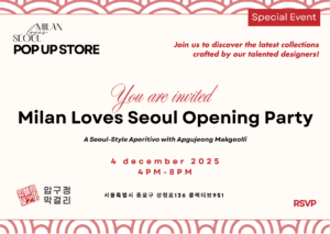 올해 첫선을 보이는 Milan Loves Seoul 프로젝트는 한국과 이탈리아 양국의 디자이너들이 한 공간에 모여 패션, 장인정신, 문화적 연결성을 바탕으로 새로운 협업 모델을 제시한다는 점에서 주목된다. 팝업스토어는 12월 4일부터 17일까지 매일 오전 10시부터 오후 6시까지 운영되며, 2주간 다양한 퍼포먼스, 브랜드 프레젠테이션, 티타임, 게스트 아티스트 프로그램 등이 이어질 예정이다.
