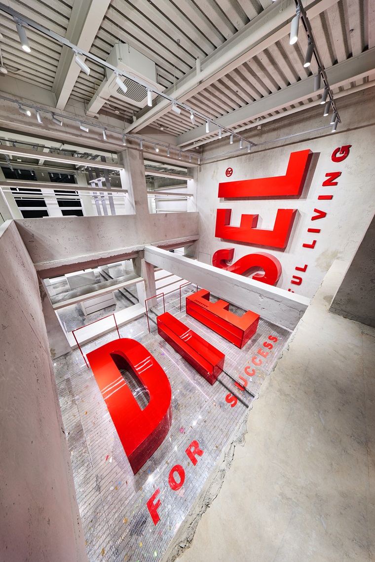 내부는 프리캐스트 콘크리트로 마감돼 현대적 브루탈리스트 미학을 구현했으며, 커스텀 가구와 나선형 계단 등 모든 디테일에 디젤만의 독창적 디자인 언어가 담겼다. 바닥 디자인 또한 하나의 아트 설치물처럼 공간 전체에 디젤의 세계관을 반영한다.