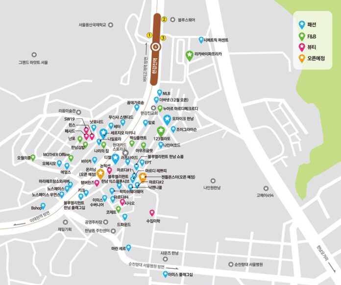 이곳 한남동 상권은 크게 세 구역으로 나뉜다. 첫 번째는 한남오거리 일대, 두 번째는 한남더힐 인근, 그리고 세 번째는 한강진역에서 제일기획 본사까지 이어지는 구간으로 구분된다. 대형 브랜드들이 주로 들어서는 세 번째 구역은 흔히 ‘꼼데가르송길’이라 불린다.
