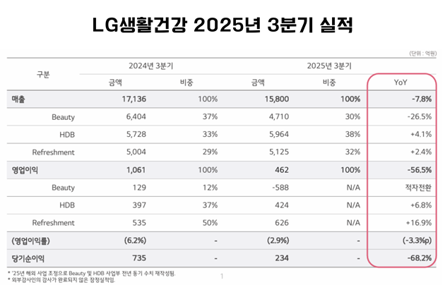◇ LG생활건강, 생활용품·음료 판매 호조 속 ‘뷰티 사업’ 부진