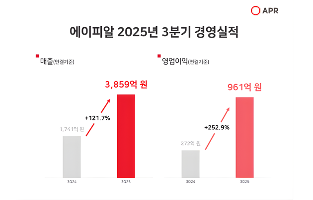 에이피알(APR, 대표 김병훈)의 잠정 실적 공시에 따르면, 2025년도 3분기 연결 기준 매출액은 3,859억 원, 영업이익 961억 원을 기록했다. 이는 전년 동기 대비 매출 122%, 영업이익 253%가 증가한 수치로, 다시 한번 분기 기준 역대 최고 실적을 경신했다.
